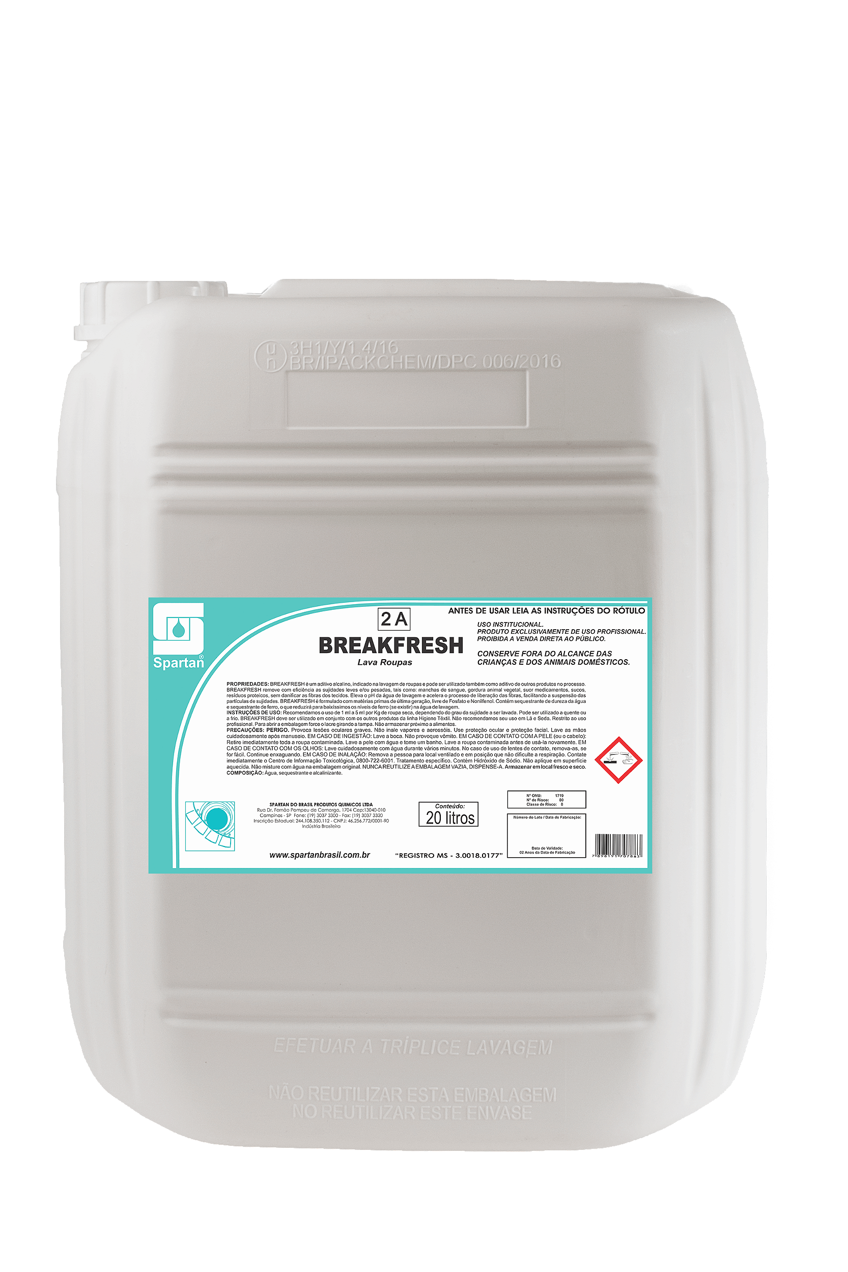 BREAKFRESH diminui significativamente a perda de performance dos detergentes da linha Higiene Têxtil Spartan, quando utilizados em processos com água dura ou ferrosa, graças à alta concentração de sequestrante em sua composição.