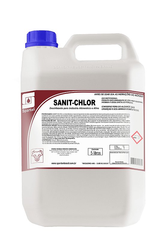 Sanit-Chlor da Spartan é um desinfetante a base de hipoclorito de sódio especialmente desenvolvido para uso geral na indústria alimentícia em superfícies como: pisos, paredes, bancadas de trabalho, equipamentos, utensílios, ou quaisquer outras superfícies laváveis onde se dê o preparo, estocagem dos gêneros alimentícios encontradas em laticínios, ordenhadeiras mecânica frigoríficos, indústria de alimentos e bebidas, através de aplicação manual, imersão ou recirculação (CIP).